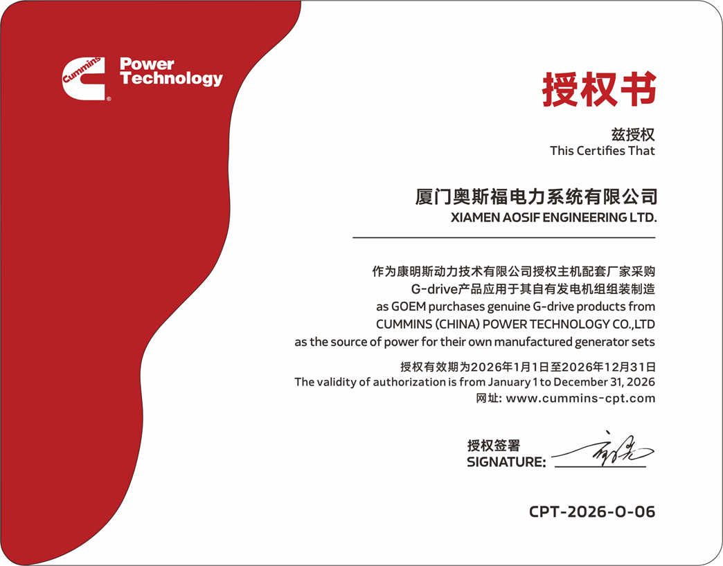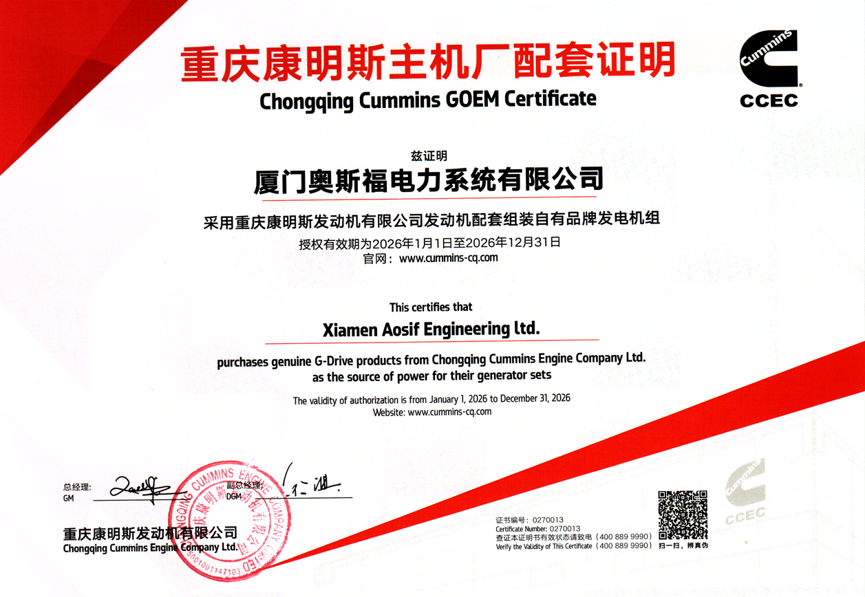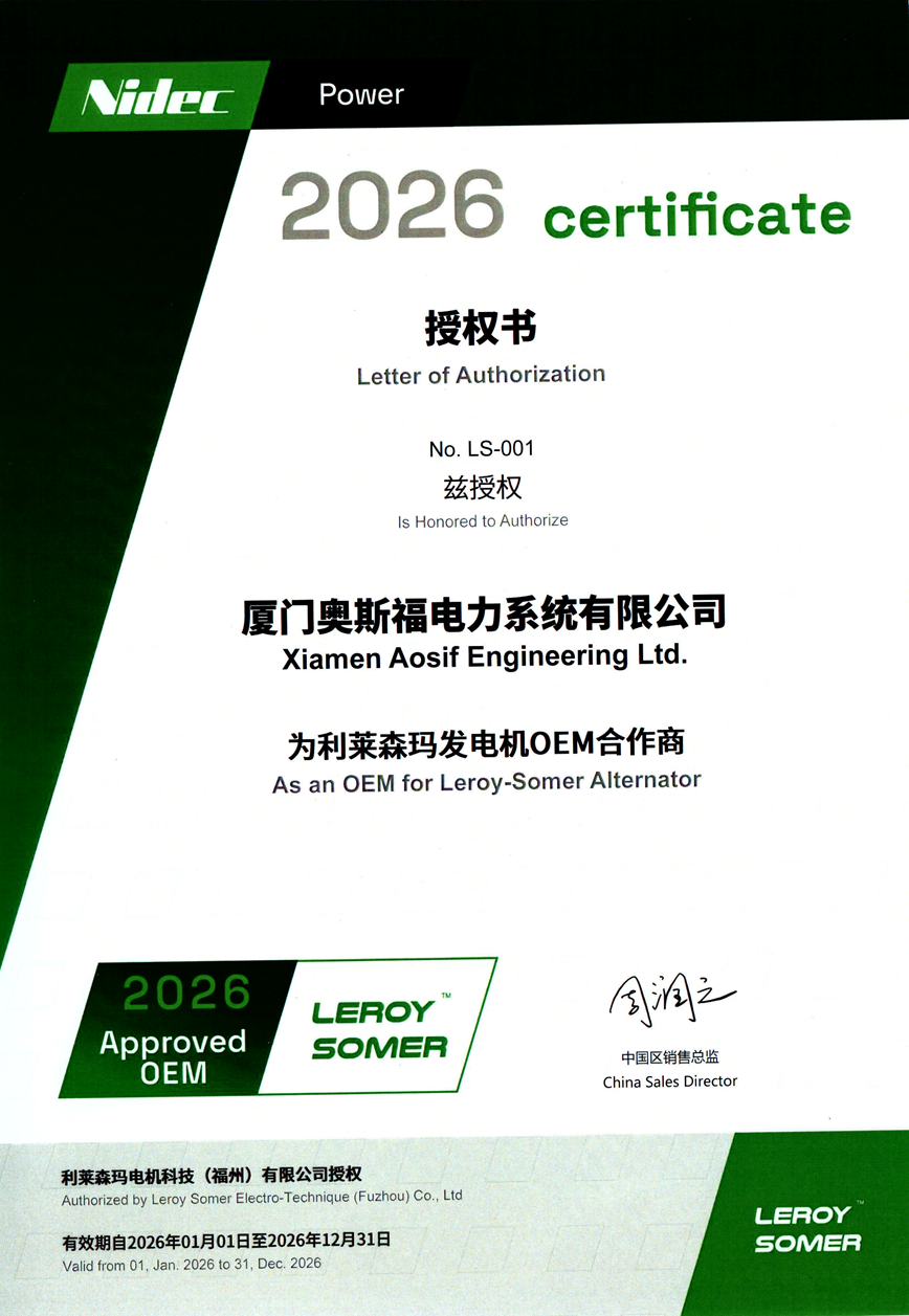 Xiamen AOSIF Engineering Ltd has focused on R&D and manufacturing of generator sets & alternators since it founding in 2001, and has accumulated rich manufacturing and service experience in this field.The manufacture base is located in Changtai Economic Development Zone with an area of 33,333 square meters, while the marketing center is settled in Xiamen Software Park Phase III.Our production and service strictly comply with ISO8525, GB/T2820-97 standards under the Management System of ISO9001 & ISO14001, and the whole series of generators have passed CE certification, which thereby ensures high quality products and service from AOSIF. .